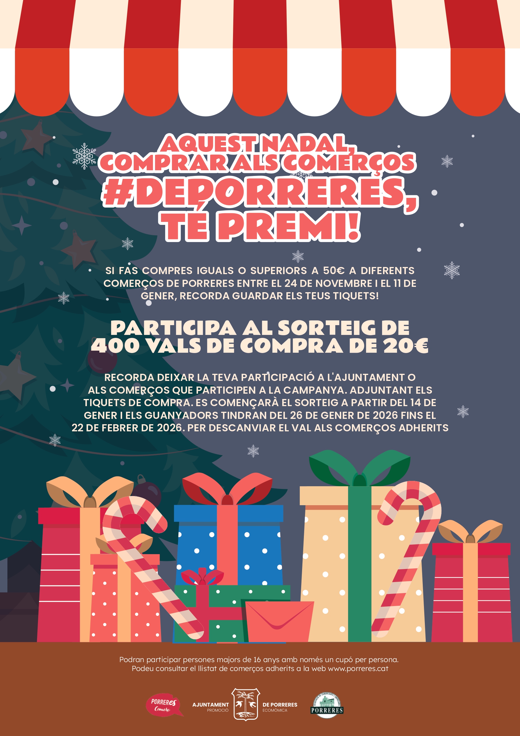 SI FAS COMPRES IGUALS O SUPERIORS A 50€ A DIFERENTS COMERÇOS DE PORRERES ENTRE EL 24 DE NOVEMBRE I EL 11 DE GENER, RECORDA GUARDAR ELS TEUS TIQUETS!