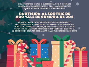 RECORDA DEIXAR LA TEVA PARTICIPACIÓ A L'AJUNTAMENT O ALS COMERÇOS QUE PARTICIPEN A LA CAMPANYA. ADJUNTANT ELS TIQUETS DE COMPRA. ES COMENÇARÀ EL SORTEIG A PARTIR DEL 14 DE GENER I ELS GUANYADORS TINDRAN DEL 26 DE GENER DE 2026 FINS EL 22 DE FEBRER DE 2026. PER DESCANVIAR EL VAL ALS COMERÇOS ADHERITS.
