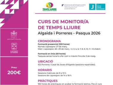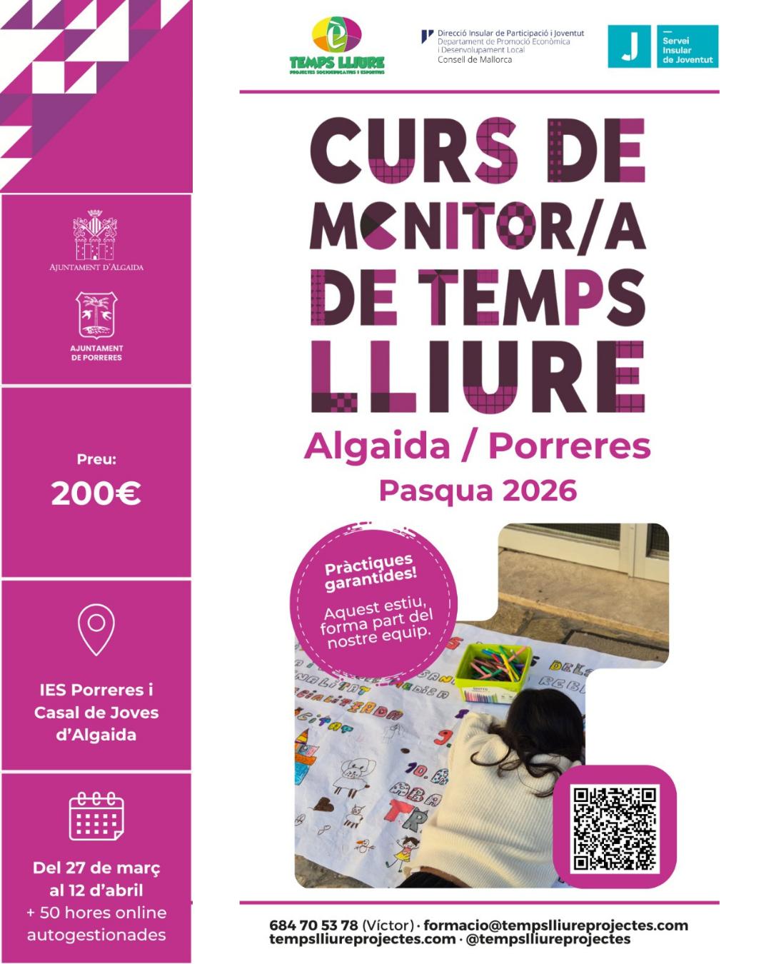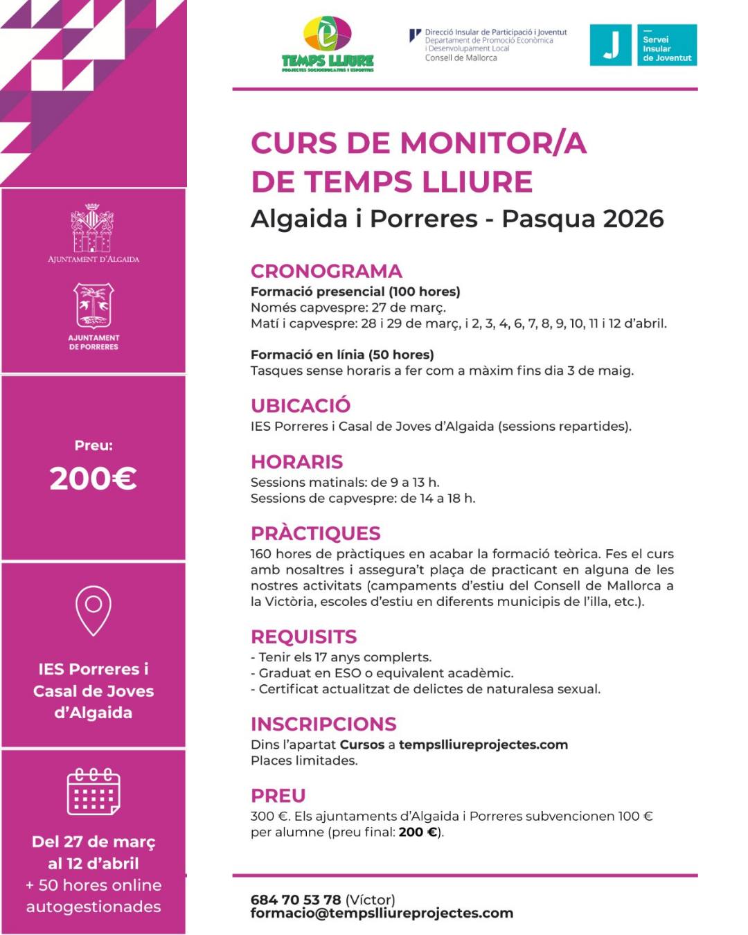 Formació adreçada a joves que vulguin obtenir el títol de monitor/a, amb sessions presencials a Porreres i Algaida, formació en línia i pràctiques assegurades.