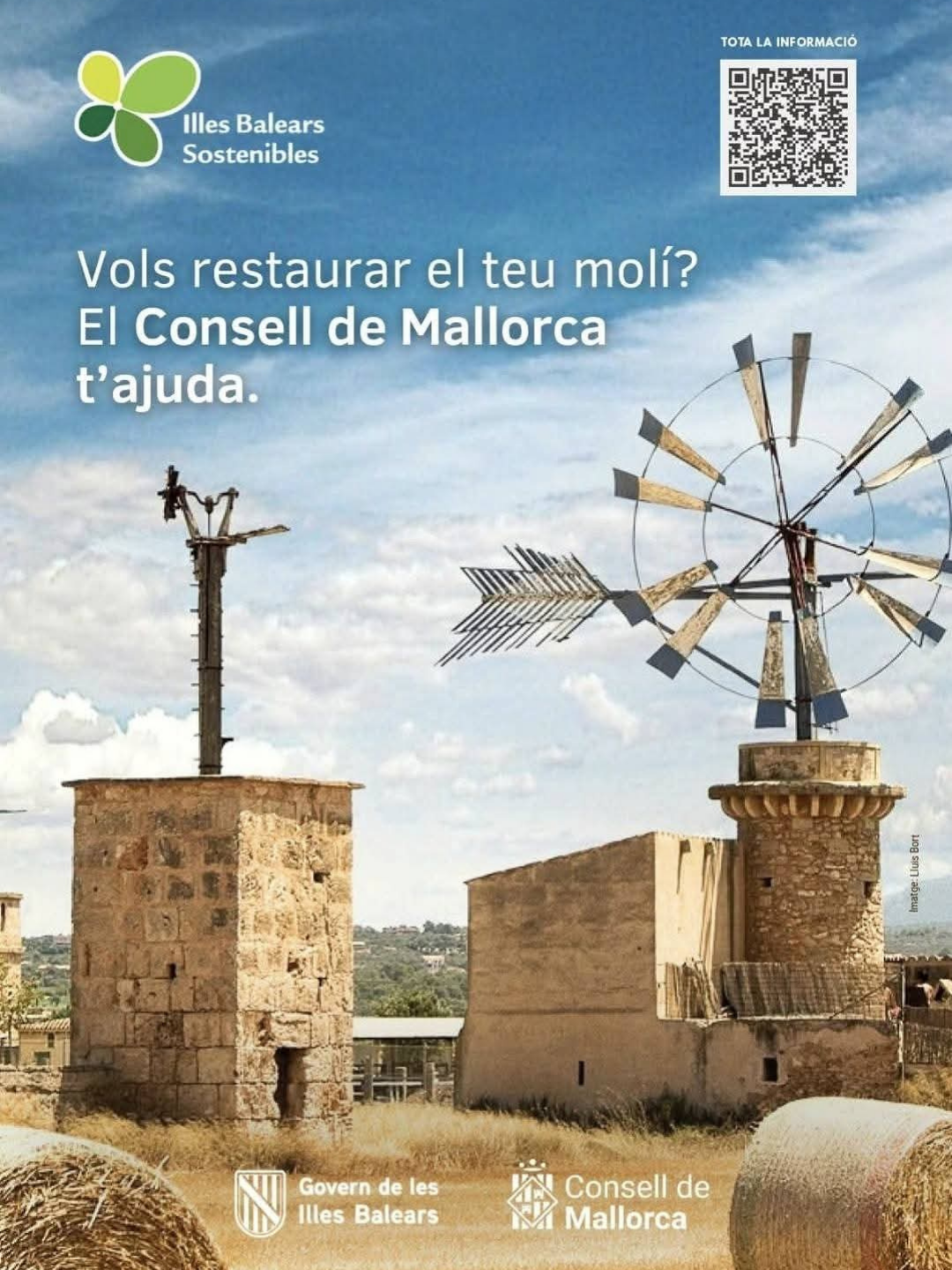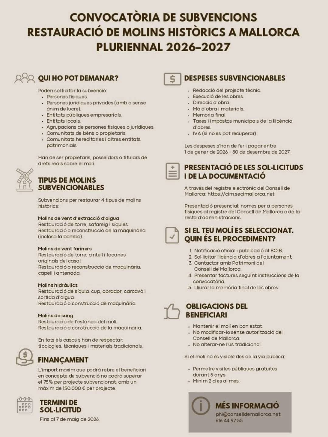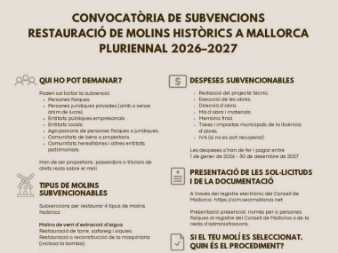 El Consell de Mallorca ha publicat la convocatòria de subvencions per a la restauració de molins històrics de Mallorca, corresponent als anys 2026-2027.
